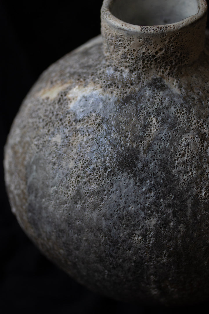 A unique hand-built vase inspired by planets' satellites. The piece is built entirely by hand with a grey stoneware clay. Once it survived the first firing at 960C, I glazed with my lava glaze.