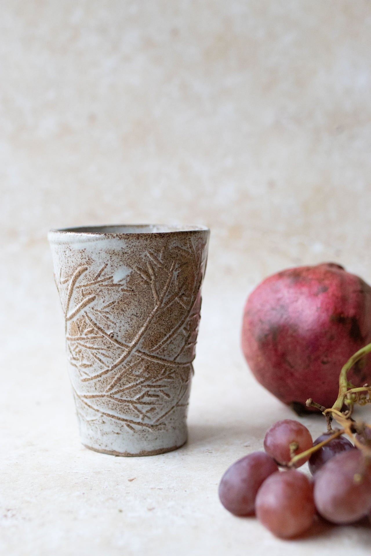 Eine handgebaute Tasse, Strukturiert mit dem Rosmarinmuster und glasiert mit meiner eisblauen Glasur.
