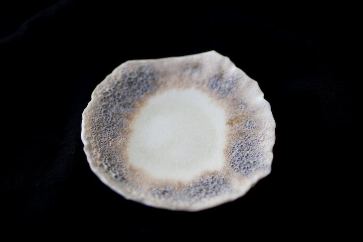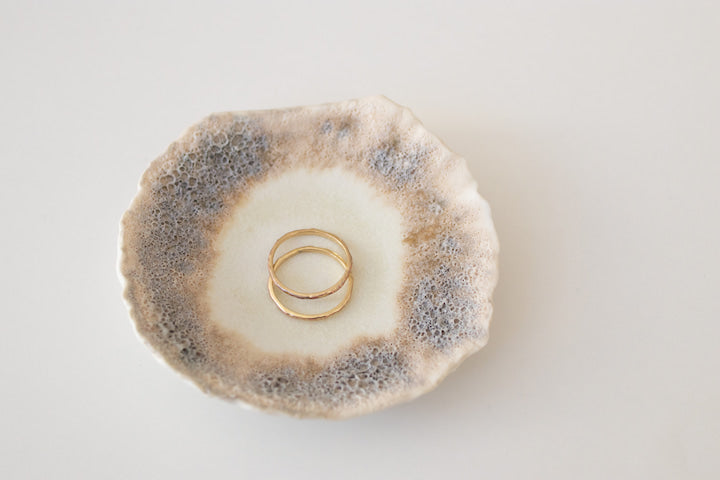 Diese Porzellanringschale hat einen Durchmesser von etwa 9 cm. Sie wurde vollständig von Hand geformt und mit meiner mattweißen und Lavaglasur glasiert, die ich beide entwickelt und hergestellt habe.
