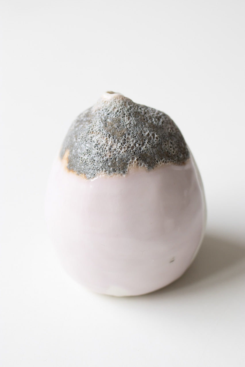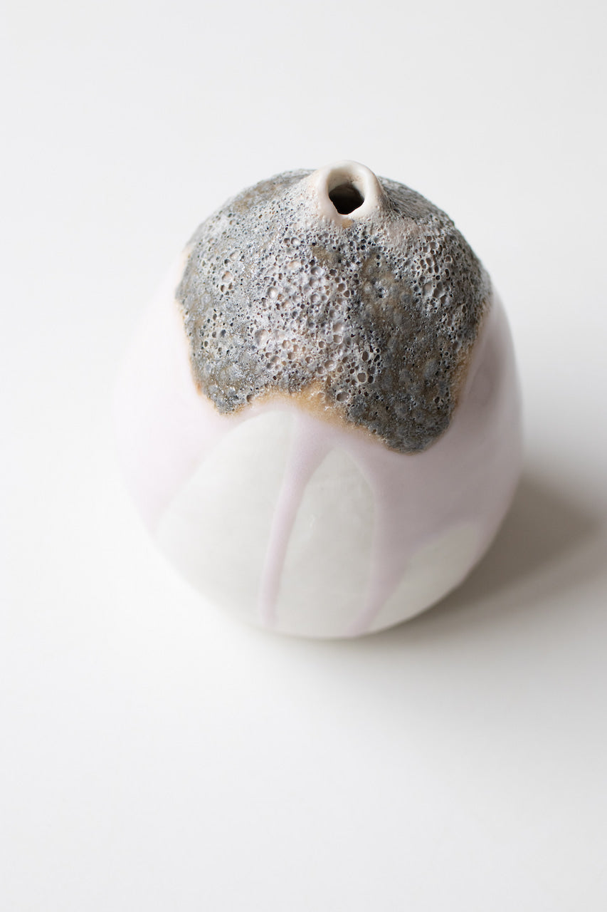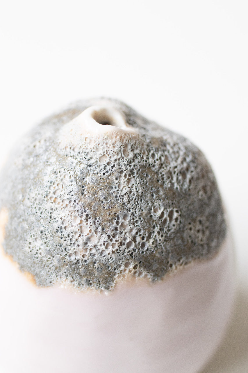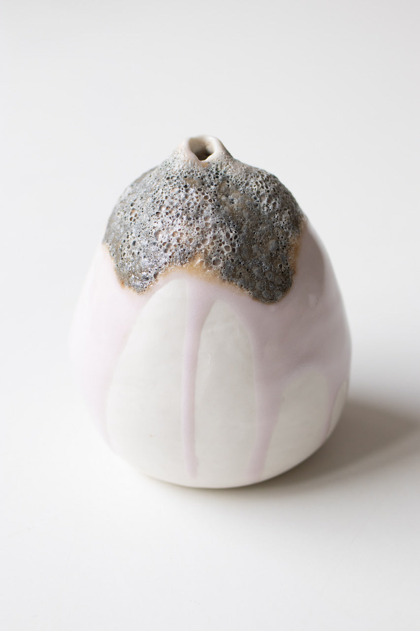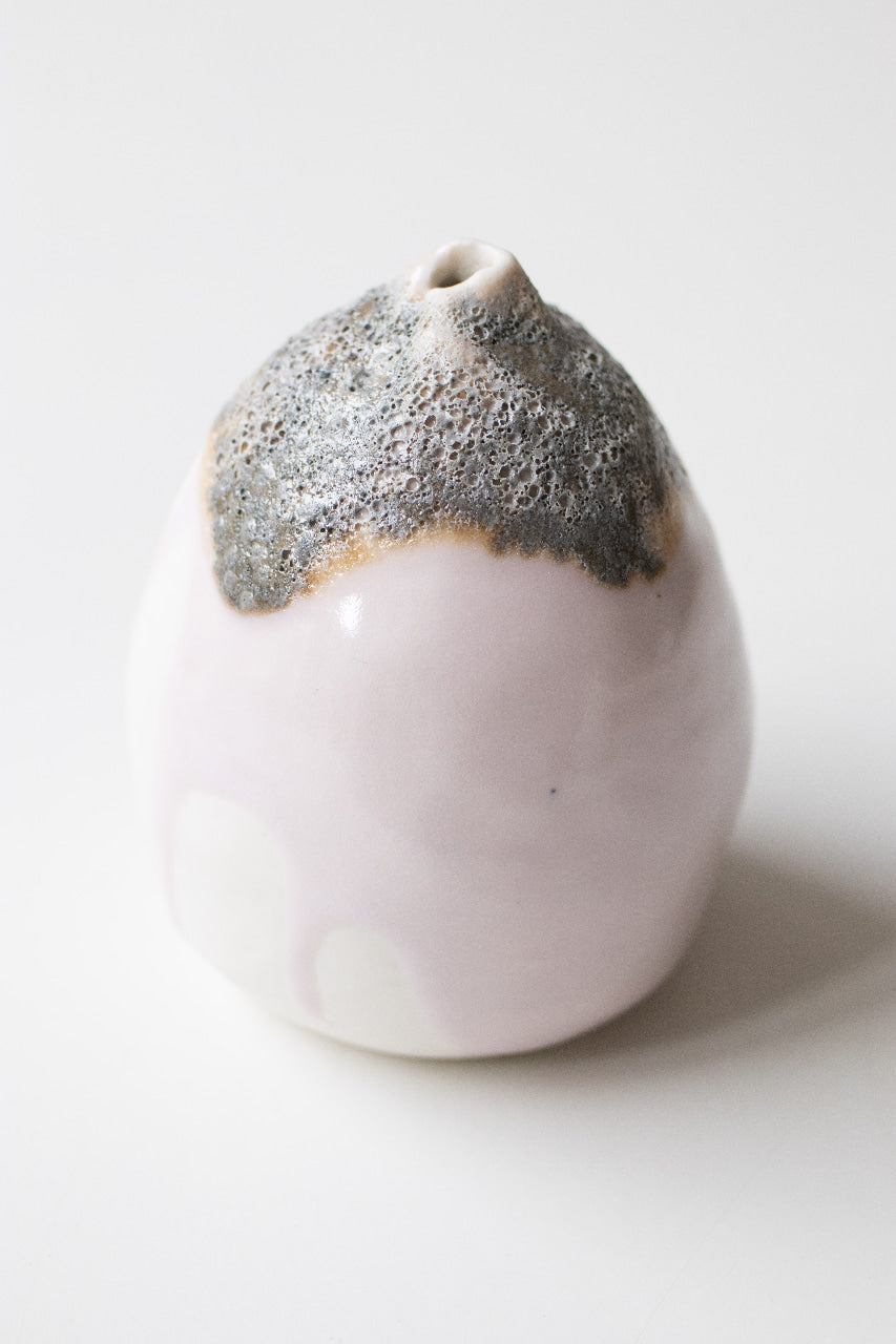 The small vase was coiled by hand and fired up to 1240C. Skathi is made with porcelain . It is glazed inside with a white matte glaze and features my erbium and lava glazes outside.