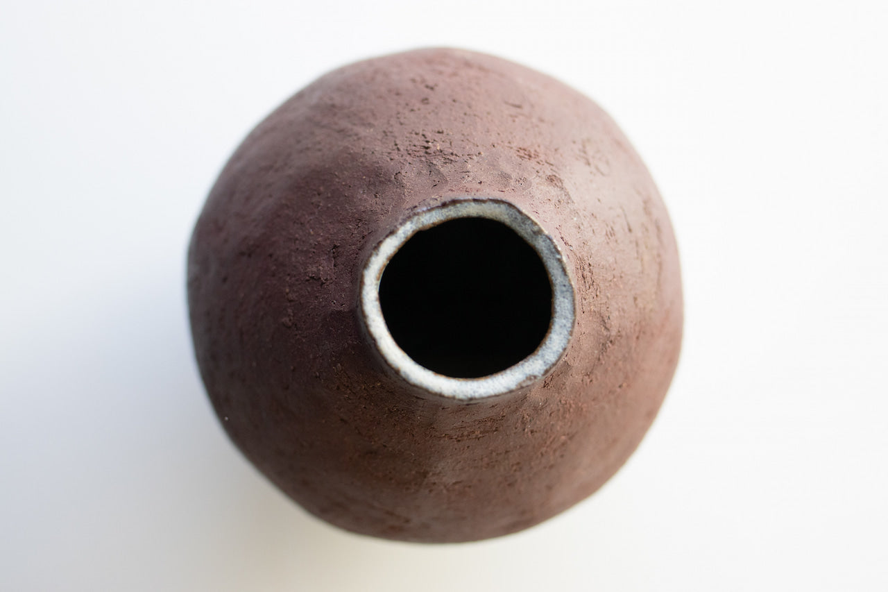 The vase was coiled by hand and fired up to 1240C. Thrymr is made with a red clay and partially covered with porcelain slip. It is glazed inside and left unglazed outside.